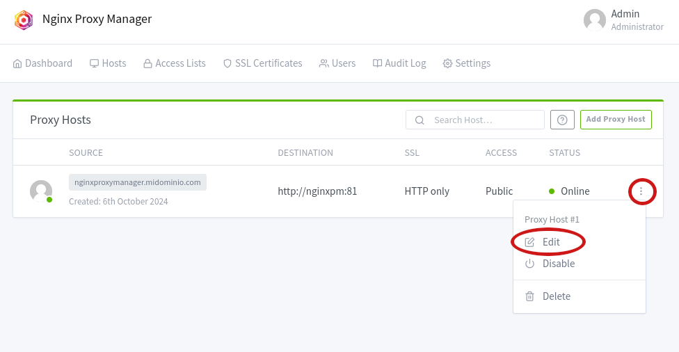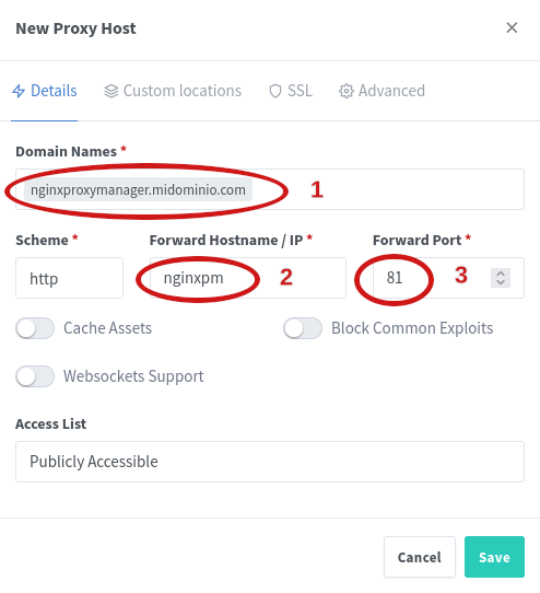 Con Nginx Proxy Manager ya instalado, se lo puede configurar para ingresar a través de un dominio y certificado SSL, sin necesidad de usar el puerto 81.