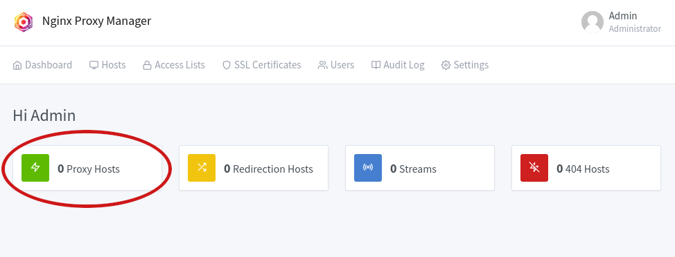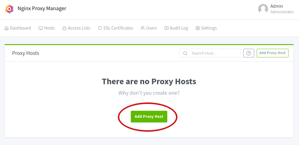 Ir a la sección Proxy Hosts y seleccionar el botón Add Proxy Host