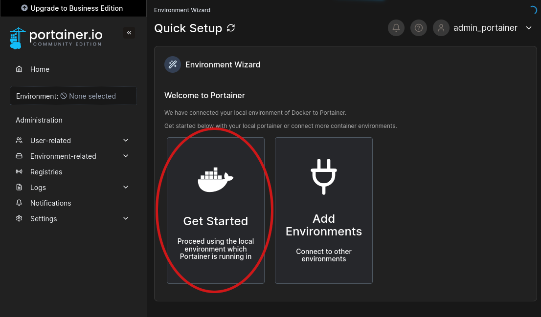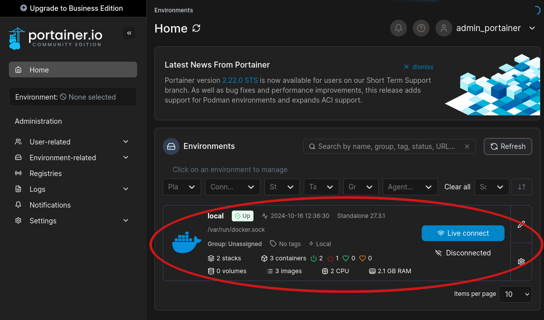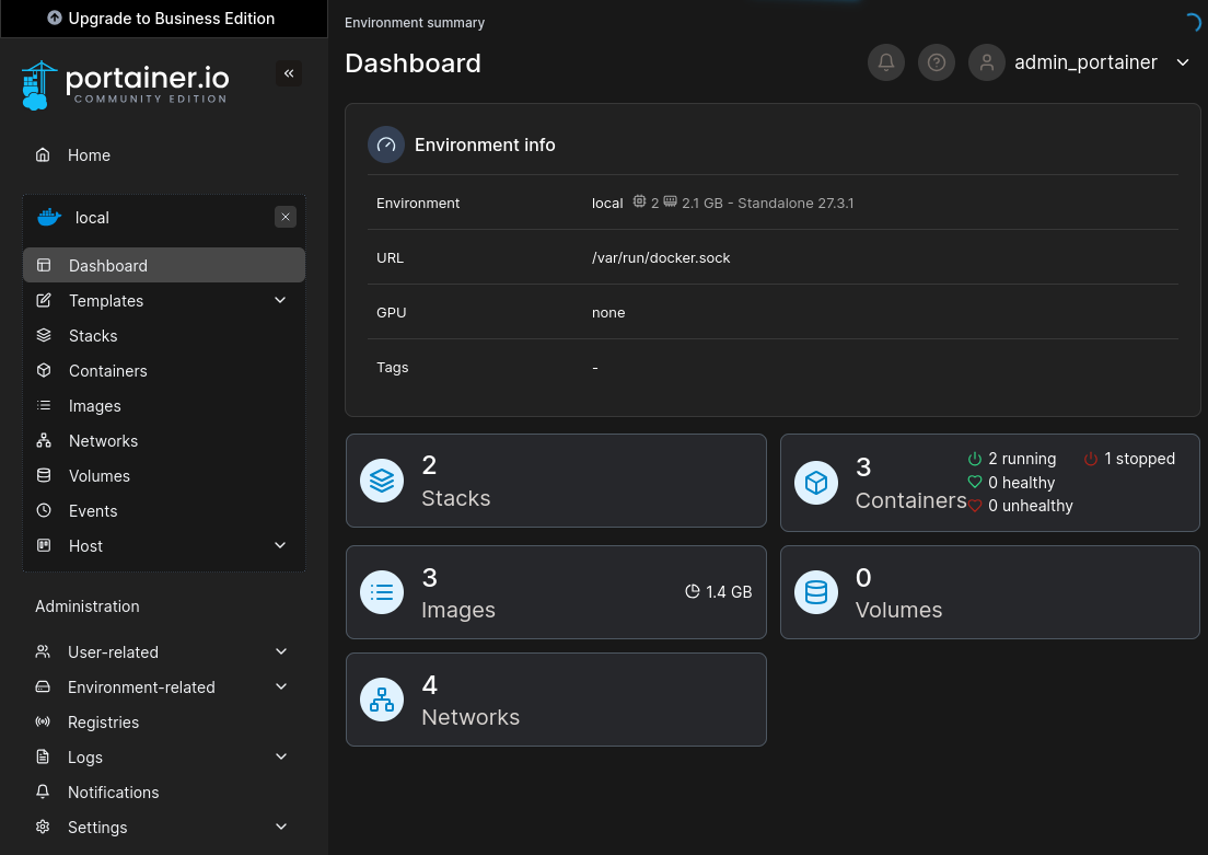 Ya está Portainer configurado con lo inicial, se pueden ver diferentes opciones en el panel.