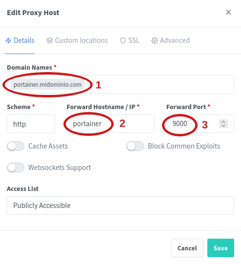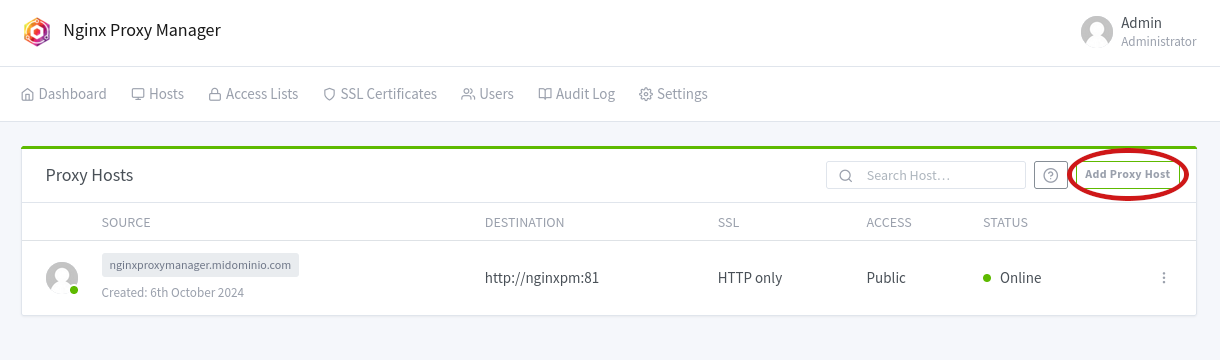 Ir a la sección Proxy Hosts y seleccionar el botón Add Proxy Host