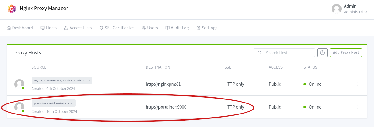Comprobar en el navegador que funciona el dominio elegido. En el ejemplo sería http://portainer.midominio.com